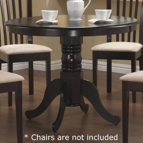 With relaxed elegance, this round pedestal table will make a charming addition to your breakfast nook or casual dining room. The delicate carved detail and generous curves of this single pedestal offer graceful designs. Arrange with matching upholstered side chair to add a touch of contemporary flair. Available in a rich cappuccino finish or oak finish.