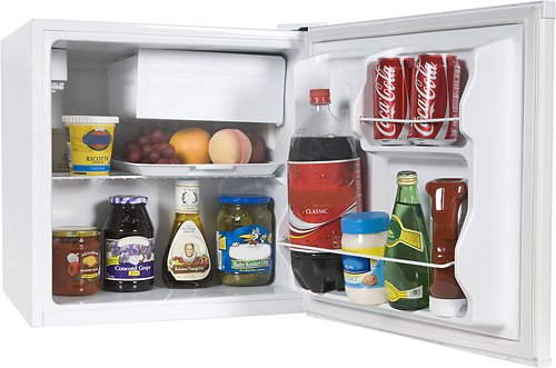Ideal for dorm rooms, bar units and other locations that require compact refrigerator storage is the Haier 1.7-cubic feet. Compact refrigerator in white has a full-width shelf that slides out smoothly to offer easy access to your refrigerated goods. The refrigerator's full-width and half-width door shelves offer extra storage space, and its 2-liter door bottle storage is great for juice containers, soda bottles and other 2-liter items.