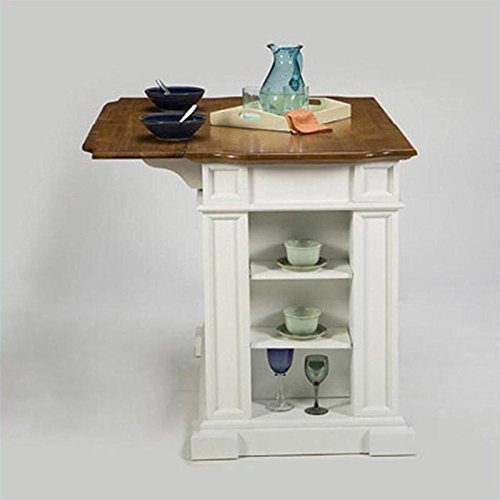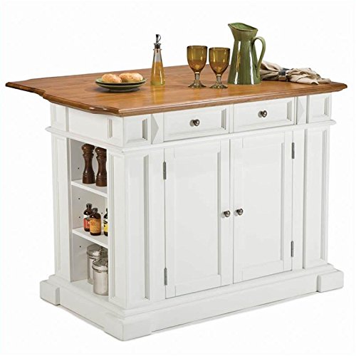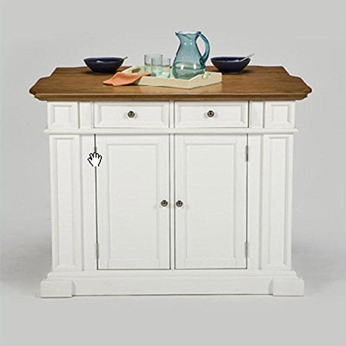 Versatile, functional and stylish all describe this kitchen island with its white finished body and coordinating cottage oak finished top. Enhancing the overall style, the top features hand applied physical and finished distressing. The island not only provides added kitchen work surface and storage but with its 11-1/2-inch breakfast bar extended also provides a convenient place to grab a bite to eat or enjoy a morning cup of coffee. Find adjustable shelving on both ends of the island as well as two utility drawers and two cabinets, each with two adjustable shelves yielding lots of storage. Construction is of sustainable hardwood with a clear coat finish helping to protect against wear from normal use. Requires assembly. Measures 49-3/4-inch width by 26-1/2-inch depth by 36-1/2-inch height.