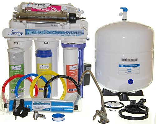 Based on legendary Best Seller #RCC7, featuring 11W UV Sterilization Lamp with Smart Flow Sensor Switch and Alkaline pH+ and mineral balls, make this model the most conprehensive Reverse Osmosis water filter system in the market. In responding to customers review about the older model of UV that is constantly on, although the feature is still very common in today¡¯s market, we do feel the pain of customer. Therefore, we have developed a new model of transformer that features an inline Flow Sensor. Whenever you turn on drinking faucet and water starts flowing, the UV is powered on automatically to kill 99% of bacteria and viruses. It turns off automatically when water is off. It prevents a potential heat hazard and extends the life of the UV light bulb dramatically. You will enjoy the cleanest great tasting water with healthy minerals right from your tap at merely 3 cents per bottle. What's included 1st Stage: 5 micron sediment filter in See-through clear housing, lasts 6-12 months 2...