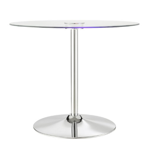 Home Creek Elysium LED Dining Table. Home Creek Elysium LED table, is a contemporary furniture pieces that features a tempered glass table top that transitions. Is a true innovative furniture that will sure impress your guest. Table is lifted on a neutral chrome base that furthers the table's modern inventive design. Set includes: One Round Dining Table, Battery Powered LED Light, & Tempered Glass Top. Materials: Metal, Chrome. Other Accessories Not Included. Dimensions: 29.5"H x 35.4" Diameter