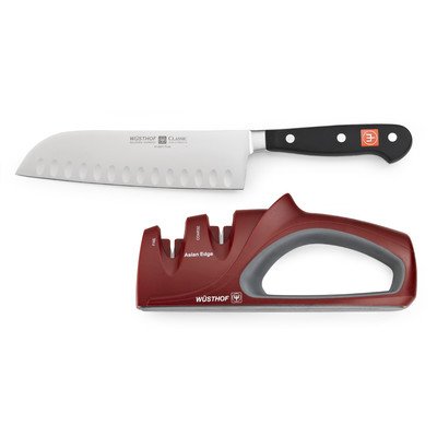- Red plastic sharpener and high carbon stainless steel Santoku blade