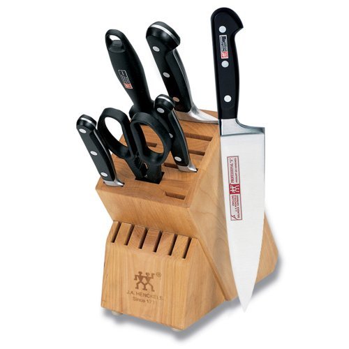 J A Henckles Knives Professional S 7 Piece Block Set 35666 000 - A great starter set, this deluxe Hardwood Block Set includes the following Henckels Knives: 3" Paring Knife, 5" Utility/Serrated Knife, 8" Carving Knife, 8" Chef's Knife, Kitchen Shears, Sharpening Steel, Solid Hardwood Block Triple riveted novodur handles are durable, strong, smooth, comfortable, and perfectly balanced Knives are dishwasher safe, although not recommended Henckels offers a full lifetime warrantyThis set supplies a cook with a variety of cutting edges and a solid hardwood block to store them in. The set consists of an 8-inch chef's knife, a 5-inch hollow-edge santoku, a 5-inch serrated utility knife, and a 3-inch paring knife. A 9-inch sharpening steel keeps their edges in order, and a pair of kitchen shears to snip herbs, flowers, or string is also included. Everything stores neatly in the attractive natural hardwood block. Classic three-rivet handles distinguish Pro S from Henckels's other quality...