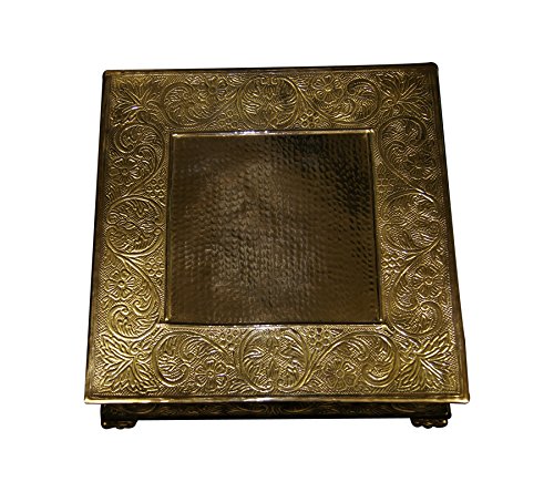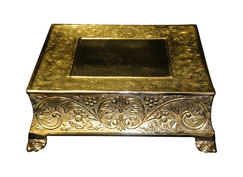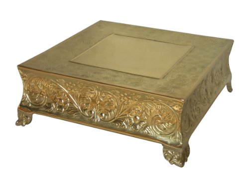 This classic cake stand is made of a very strong polished brass sheet metal. This enables the stand to withstand the weight of several layers of cakes without the fear of buckling when it is used properly. We are making this statement with confidence after selling more than 1000 cake stands in less than 12 months to our satisfied global customers. The top surface size is about 16"x16" square and height is about 6". Coated with clear lacquer to give a durable and glittering gold finish that will last for years under normal usage conditions. Embossed with a classic beautiful pattern on the side, legs, and on the top surface at border. In the center on the top surface it has a distinctive hammered design. Designed to adorn a MEDIUM wedding or any other special events multi layer cake and still will have sufficient room on the border to decorate with flowers or whatever your baker or florist decorator decides. Great for flowers, cupcakes, candy, beverage, jewelry display, photograph displa...