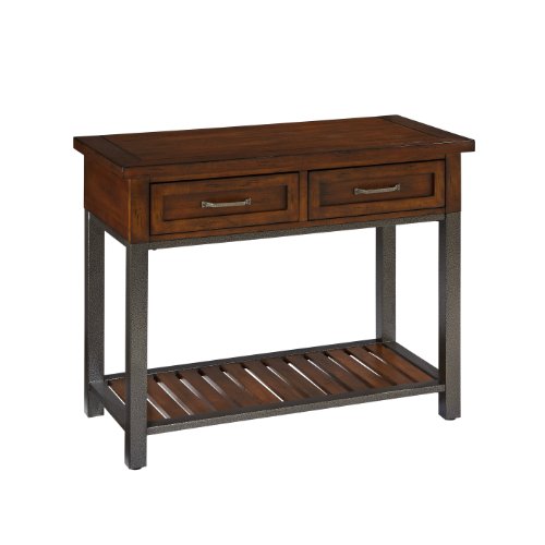 Our Cabin Creek collection conveys a reclaimed wood vintage feel. Each piece is physically distressed by hand, providing a unique one of a kind look. The Cabin Creek Buffet by Home Styles is constructed of hardwood solids and veneers in a heavily distressed multi-step chestnut finish featuring worm holes, fly specking, small indentations and season splitting. Features include two storage drawers, one lower slatted fixed shelf and a hammered metal look finished frame. Beautifully finished on all sides and is adorned by replicated hand forged hardware. Assembly required. Size: 39w 18d 30.25.