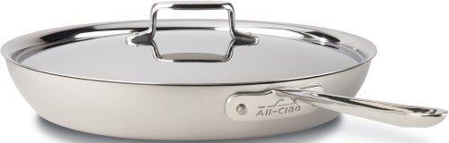 All-Clad Brushed Stainless D5 13" French Skillet with domed lid features a large surface area and round sides that hold in heat and liquids while preventing splattering, making the pan ideal for searing, browning and pan-frying a wide range of foods, including eggs and meats. The lid can be used to lock in moisture and heat after browning or searing to cook meats thoroughly on the stovetop or in the oven.