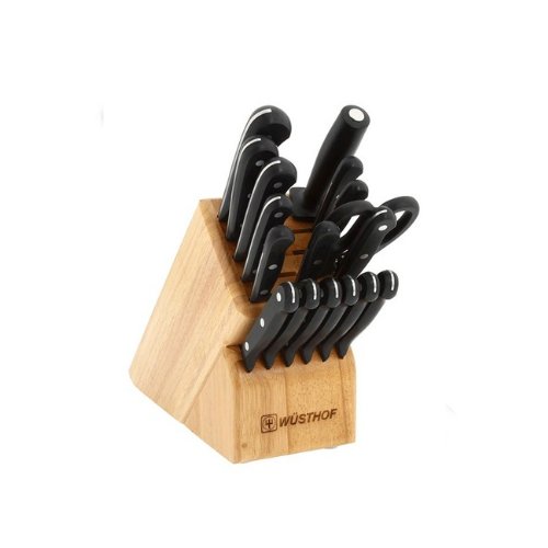 Since 1814, Wushof has been making some of the finest kitchen cutlery in the world. This 18 piece knife block set from the Gourmet line is the perfect balance of Wusthof's beauty and excellence. This set includes one peeling knife, one trimming knife, two paring knives, six steak knives, two utility knives, one kitchen knife, one bread knife, one chef's knife, one honing steel, one pair of kitchen shears, and one 17 slot knife block. Constructed of high carbon stainless steel, the blades of these knives are rust and stain resistant, and are perfect for nearly every kitchen task. The triple riveted handles are ergonomically designed for an easy comfortable grip. The wooden 17 slot knife block included with this set matches any kitchen decor, while handsomely and safely storing all of the pieces of the set. Best of all, this set is backed by a manufacturer's limited lifetime warranty, and is NSF certified for commercial use.Peeling knife -- 2-1/4" L; Trimming knife -- 2-1/4" L; Paring kn...