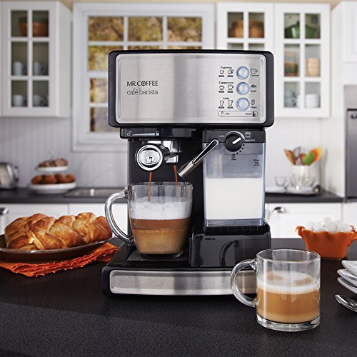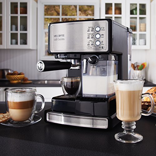 Brew coffeehouse-quality espresso drinks from the comfort of home--with just one touch. view larger Mr. Coffee Café Barista--coffeehouse drinks in one simple touch. Be Your Own Barista Go ahead. Indulge. This easy-to-use Café Barista espresso maker from Mr. Coffee makes it easy to create coffeehouse-quality espresso drinks just like a professional. Now anyone can enjoy gourmet espresso-based drinks from the comfort of home--no more unnecessary trips to the cafe. Make a Variety of Coffeehouse Drinks Effortlessly brew anything from rich aromatic espressos, creamy cappuccinos, and luscious lattes to more decadent variations like toffee lattes, cafe mochas, espresso martinis, and caramel cappuccinos. And that's just the tip of the whipped, frothy topping--a recipe guide loaded with 20 different delightfully delectable recipes comes included. Convenient & Easy to Use With user-friendly controls that even a novice can master, the sleek machine makes it easy to brew delicious coffe...