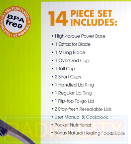 Includes a power base, 1 tall cup, 2 short cups, 1 handled lip ring, 1 non handled lip ring, 1 extractor blade and 1 milling blade, 2 re-sealable lids, 1 Flip-top to-go lid with oversized mug, pocket nutritionist, natural healing foods book and manual