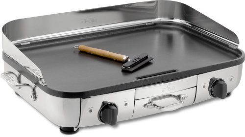 All-Clad's legendary quality and design come together once more in the Electric Griddle: Full metal construction with polished stainless steel exterior. Signature cast stainless handles and rivets for easy and secure handling. A generous 20 x 13 inch non-stick cooking surface with drainage slot that allows juices to flow into a removable tray. The two independent side by side adjustable thermostats give you freedom to cook foods requiring different cooking temperatures from keep warm at 180F to sear at 480F. The griddle also includes a stainless steel removable anti-splatter guard that keeps counter area clean.