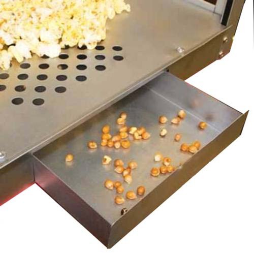 Stirring system for even heating; built-in heat lamp; pullout tray catches unpopped kernels