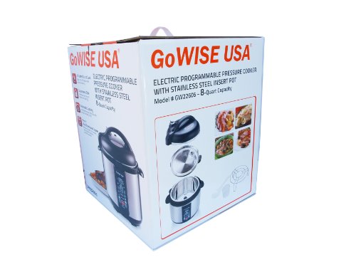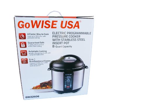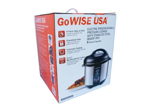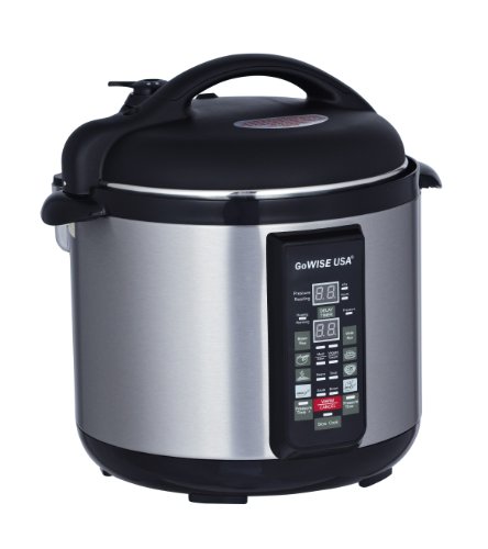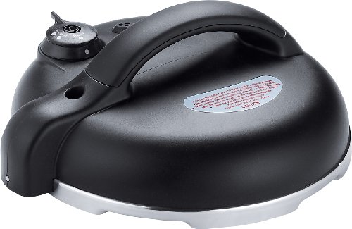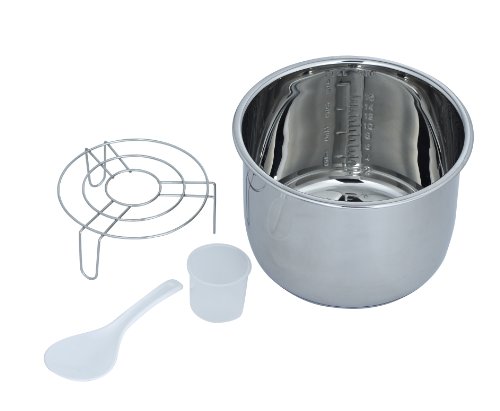 This pressure cooker includes a removable and durable stainless steel cooking pot; stainless steel outer body with cool touch handles; stainless steel self-locking lid with rubber gasket, floating valve, anti-blocking case, pressure safety valve, pressure regulator knob, locking pin, and cool touch handle; stationery pot; heating plate; temperature sensor; and condensation reservoir. It also comes with a stainless steel rack, plastic cup and spoon. 120V, 50-60Hz, ETL approved.