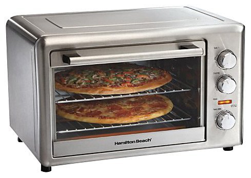 Hamilton Beach Countertop Oven with Convection & Rotisserie 31103 Small enough to fit on your kitchen counter, but large enough to help you prepare for any meal or party, the Hamilton Beach Countertop Oven with Convection & Rotisserie boasts full-size oven performance in compact, energy-efficient form. Designed with both kitchen style and practicality in mind, the Countertop Oven with Convection & Rotisserie is portable and countertop convenient. It's packed with versatile cooking options that range from baking cakes to crisping cookies to broiling salmon to roasting an entire 5 lb. chicken, roast or pork. There's no need to spend extra time cooking separate meals for the pickier ones, either. The wide interior and adjustable cooking racks provide double the space for cooking multiple foods at once. What's more, this oven is ideal for anyone, anywhere and anytime. It can replace the microwave in your office, offer easy cooking access for the elderly, serve as a staple for apartm...