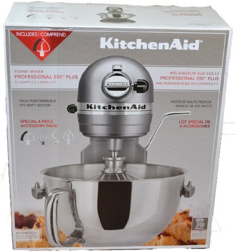 Designed for long life and quiet operation, the KitchenAid stand mixer is the one mixer that generations have depended on for power, performance and durability. Built to handle large batches easily, this professional mixer features a rugged, all-metal construction, a powerful 575-watt motor, and KitchenAid's unique planetary mixing action that reaches every part of the bowl. Attachments (Included): Burnished flat beater, Burnished professional dough hook and Professional wire whip. UL listed. Made in the USA.Dimensions: Measures 13.3" wide x 14.6" deep x 16.5" high; 25 poundsElectronic speed control 5.5 quart polished stainless steel bowl with handleErgonomically designed bowl lift handle for a comfortable no slip grip; Large capacity Heavy-duty bowl lift leverFive rubber feet to protect countertops and help ensure mixer stabilityAlso Features: Fan cooled motor, Commercial auto reset, Locked rotor protection and a Hinged hub coverCare Instructions: Wipe with towel