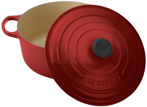 Le Creuset Signature Enameled Cast-Iron 7-1/4-Quart Round French Oven, Cherry Shown in Flame Color Shown in Flame Color Also known as a Dutch oven, this updated kitchen classic enhances the cooking process by evenly distributing heat and locking in the optimal amount of moisture. With ergonomic handles and an advanced interior enamel that resists chipping and cleans easily, Le Creuset's French ovens blend the best of the past with the latest innovations in comfort and functionality. Colorful, long-lasting exterior enamel resists chipping and cracking; interior enamel is engineered to resist staining and dullingSand-colored interior enamel makes it easy to monitor food as it cooks, preventing burning and stickingOversized handles provide even weight distribution and a secure gripErgonomic composite knobs are heat resistant to 500�FBuilt-in lid stabilizers provide a secure, no-slide fitThe lightest weight per quart of any premium cast iron cookware available Each piece from our e...