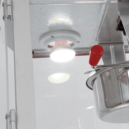 - Stirring system for even heating; built-in heat lamp; pullout tray catches unpopped kernels