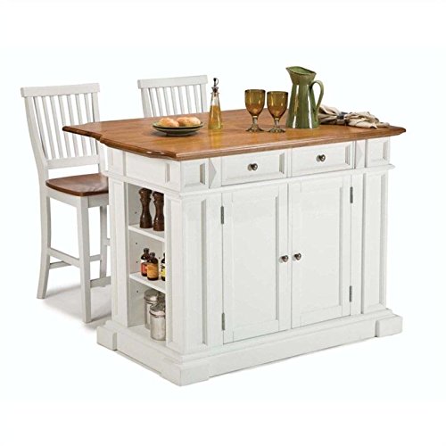 Versatile, functional and stylish all describe this updated traditional kitchen island with its white finished body and coordinating cottage oak finished top. Enhancing the overall style, the top features hand applied physical and finished distressing. The island not only provides added kitchen work surface and storage but with its 11-1/2-inch breakfast bar extended also provides a convenient place to grab a bite to eat or enjoy a morning cup of coffee. Find adjustable shelving on both ends of the island as well as two utility drawers and two cabinets, each with two adjustable shelves yielding lots of storage. Construction is of sustainable hardwood with a clear coat finish helping to protect against wear from normal use. Matching stools finish the set for maximum functionality. Kitchen island Features include convenient drop leaf that raises to provide dining/serving space, convenient drop leaf that raises to provide dining/serving space, antique nickel hardware, easy glide storage dr...