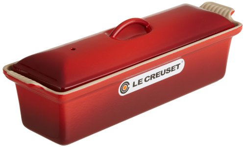 Long appreciated as both a cooking and serving dish, the terrine was traditionally used to compact a forcemeat mixture like pâté (resulting form is also referred to as a terrine). Some terrines include a weighted press that molds the mixture from all sides. As the meat cools, the fat contained within it begins to set, helping the terrine hold its form. Drawn from early Le Creuset designs from the 1930s and 1940s, this cast-iron pate terrine also works well for baking cakes, breads, and lasagna, or for assembling a frozen dessert of sponge cake and ice-cream layers. The elongated rectangular-shaped dish measures 4 by 12-2/3 inches and can hold up to 1-1/2 quarts. Like other pieces in Le Creuset's line of enameled cast iron, the cookware's exterior features a colorful, long-lasting enamel that resists chipping and cracking, while its durable, nonreactive sand-colored enamel interior offers a smooth surface for cooking and an optimal palette for food presentation. As cast iron is unexc...