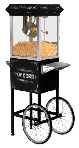 Make this fun and entertaining Elite Deluxe 8Oz. Kettle Popcorn Trolley the centerpiece of all of your parties and gatherings. It features an 8 oz. stainless steel kettle that can pop up to 3 gallons of popcorn per batch in just 5 minutes. With its eye-catching black and silver design the Elite Popcorn Trolley is always the life of the party! Easy to use and fun to watch, it also comes equipped with a warming feature to keep your popcorn warm and fresh throughout the party. The convenient 2-in-1 design allows the Popcorn trolley to be used as a tabletop machine or as a pushcart popcorn trolley.