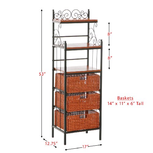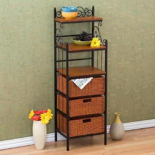 Elegant and beautiful, this three-drawer kitchen rack will help with storage, display and organization all in one. Three lower brown stained rattan baskets function as removable drawers while three open shelves on top provide versatility. Decorative scrollwork laces the top for a classic touch.