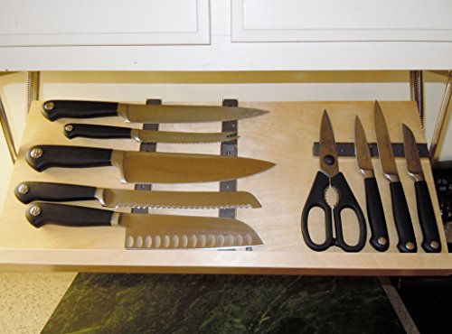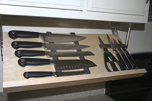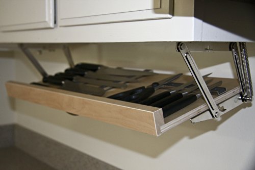 The Drop Block offers two sizes for your under cabinet knife storage. The smaller unit is ideal for people with VERY limited cabinet space. The Drop Block removes clutter from your counters and allows you to see your entire selection of knives. With a traditional knife block, you are constantly lifting one knife after another to see if it is the one you want. With The Drop Block this is eliminated because all knives are right in front of you when lowered. When The Drop Block is raised, they are out of sight and safely tucked away.
