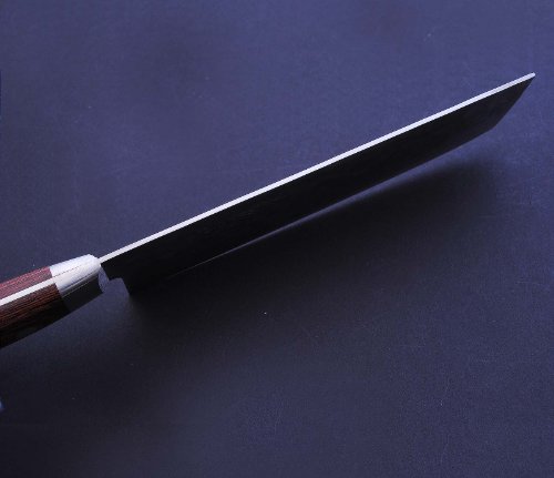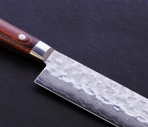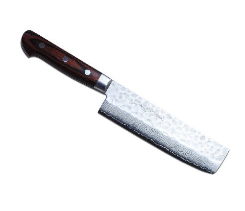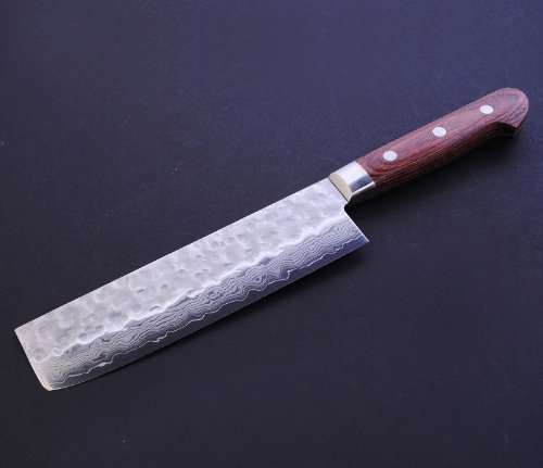Yoshihiro hammered Damascus knives have 16 layers of VG-10 Gold, a Japanese Super Steel. The knife Is stain-resistant and durable. The usuba/nakiri is a vegetable chopping knife. The thin blade can chop through dense vegetables without breaking them.