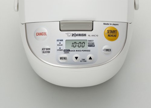Zojirushi NL-AAC10 5-1/2-Cup (Uncooked) Rice Cooker and Warmer The NL-AAC10 Micom Rice Cooker & Warmer uses advanced micro computerized fuzzy logic technology for perfect rice every time. Not only does it cook flawless rice but it also comes with a steaming basket to double as a steamer. This 5-1/2-cup rice cooker and warmer makes 10 cups of cooked rice and includes a variety of cooking functions including white rice/sushi, mixed rice, porridge, sweet, brown, steam, and quick cooking. This unit uses a black thick inner cooking pan that provides even heating for better cooking and has an interchangeable melody and beep signal to indicate when the cooking cycle has ended. Other highlights include a detachable and washable inner lid, an easy-to-read LCD control panel, and automatic keep warm, extended keep warm and reheating cycle, delay timer with two settings and also a detachable power cord for easy storage. The plastic body is dent resistant and easy to clean. Accessories includ...