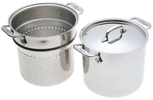 Hot, aromatic, and delicious pasta is easily prepared using this pasta pentola by All-Clad. Essentially a large stock pot with a pasta insert, it is constructed of three layers of metal; two stainless steel outer layers with an aluminum core. The stainless steel exterior combined with the aluminum core allows the pot to be used on all types of stovetops, including induction, and heats it evenly to eliminate hot spots. The included stainless steel lid holds in heat and steam, and has an easy to grasp handle, along with looped side handles for a design that's easy to move around the kitchen. Producing some of the finest cookware in the nation, All-Clad has been featured in many high class and gourmet restaurants for its superior performance and aesthetically designed pieces crafted from American artists using the finest metals. A firm believer in quality over convenience, All-Clad's metals are formulated and bonded with cooking performance in mind, and are combined with stunning designs ...