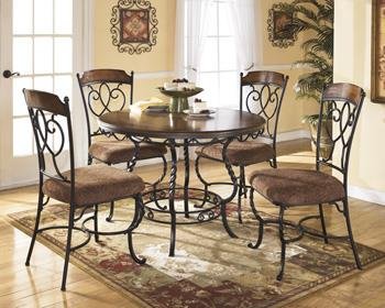The scrolling traditional design of the "Nola" dining room collection merges the beauty of wood and metal to create an elegant vision that truly transforms the atmosphere of any dining experience. The ornate beauty of the tubular metal table base, which features a rich dark metal bronze color finish, supports a luxurious table top bathed in a burnished brown finish. With the beauty of the elegantly inlaid veneer table top pattern and the subtle multi-toned chenille chair seat upholstery, this dining room furniture is an exceptional addition to the decor of any dining room. Create a dining room to be proud of with the warm inviting traditional design of the "Nola" dining room collection.