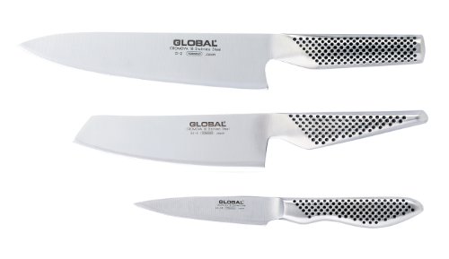 Global 3 Piece Cooks Knife Set. Set comprises of 8" chef's knife, 5.5" utility knife and 3.5" paring knife (G2, GS5 and GS38). Loved by professional chefs around the world, Global knives are an excellent choice for the serious home cook. The thin and razor sharp Global blade allows the cook to cleanly slice through foods, preserving the integrity of the ingredient and maximizing its flavor. The majority of Global knives are ground to a straight point rather than the western style of beveling the edge. To balance their knives Global uses a hollow handle that is filled with just the right amount of sand to create the correct balance. The handle has its own unique darkened dimples for a non-slip grip. Because the knives are very light weight they reduce hand fatigue. Global knives have a smooth contour and seamless, all stainless construction that eliminates food and dirt traps. Global knifes are forged in Japan from CROMOVA 18 Stainless Steel, a blend of 18 percent chromium for goo...