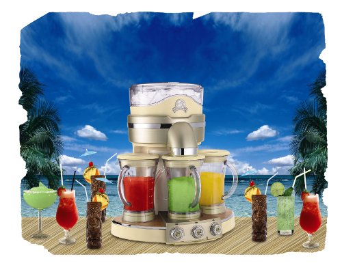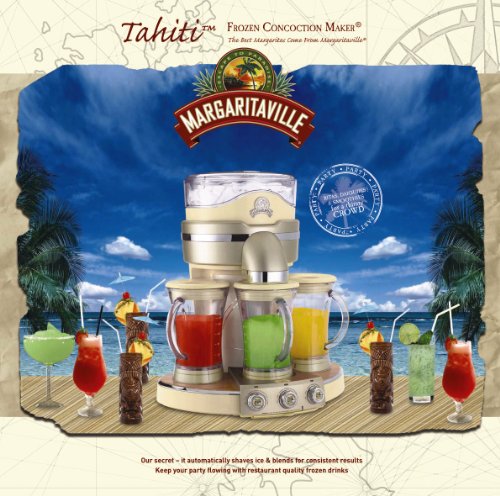 Make 3 different kinds of frozen drinks--with just the flip of a switch. view larger Margaritaville Tahiti Frozen Concoction Maker -- DM3000 Restaurant-Quality Frozen Drinks Without the Guesswork With three independent blending stations, the Tahiti offers the ultimate in frozen drink making for your biggest bash, blending a variety of restaurant-quality frozen drinks at the press of a button. Pick your favorite from six automated drink settings, programmed to shave just the right amount of ice and blend the perfect Margaritas, Daiquiris, Coladas, Mudslides, Mojitos and Smoothies. Your guests will be mesmerized as they watch the motorized ice chute rotating from one pitcher to the next creating one delicious drink after another. And the Tahiti couldn't be easier to use. Simply fill the top reservoir with ice, pour your favorite ingredients into the blending jars and, with the touch of a button, the automatic Shave 'n Blend controls create up to 72 ounces of pitcher-perfec...