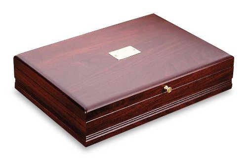The Reed & Barton Taunton chest offers simple styling and a rich mahogany finish. The chest is lined with tarinsh resistant silver cloth to protect fine flaware and holds service for 12, up to 130 pieces.