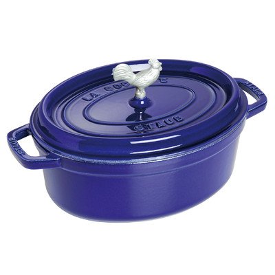 1123191 This beautiful piece adds a celebratory flair to your favorite slow-cooked recipes. A toast to this traditional French meal, the Coq au Vin cocotte brightens your table and a festive rooster knob. The size is ideal for any poultry, designed to concentrate the meat's flavorful juices. Features: -Coq au vin cocotte. -Dark blue finish. -Nickel knob for oven use. -Closed circuit and spikes cooking allows self basting. -Enameled black matte interior provides genuine flavor. -Material: Cast iron. -Smooth enamel bottom. -Made in France. -Constant and optimum performance. -Cast iron retains and evenly diffuses heat. -Induction hob compatible. -Easy to clean. -Dishwasher safe but it is advised not doing this too often. -Resists up to 500 F. -Compatible with all heat sources. Specifications: -Capacity: 5.75 qt.. -Staub provides lifetime guarantee. -Overall dimensions: 6.4'' H x 15'' W x 11.8'' D.