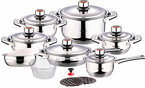 "1. 1.7 Quart / 1.6 L Casserole with lid Measurements 6"" wide x 3"" height (measurements for pot only) 2. 3.3 Quart / 3.1 L Casserole with lid Measurements 8"" wide x 4"" height (measurements for pot only) 3. 6.7 Quart / 6.3 L Casserole with lid Measurements 9"" wide x 5.5"" height (measurements for pot only) 4. 3 Quart / 2.9 L Frypan with lid Measurements 9"" wide x 2.5"" height (measurements for pot only) 5. 3.3 Quart / 3 L Steamer Measurements 8"" wide x 4"" height (measurements for pot only) 6. 2 Qt / 1.8 L Saucepan with lid Measurements 6"" wide x 3.5"" height (measurements for pot only) 7. 8"" Mixing Bowl with lid 8. Frying Basket 9. Bakelite Mat x 2 pcs 10. Suction Knob Here are a breakdown of each of the 9 Layers which allows this cookware to cook food so Pure and evenly. Layer 1: AISI 430 Stainless Steel (For Induction) Layer 2: Aluminum Alloy (Distributes Heat) Layer 3: Pure Aluminum (Distributes Heat) Layer 4: Aluminum Alloy (Distributes Heat) Layer 5: T-304 Surgical Stainl...
