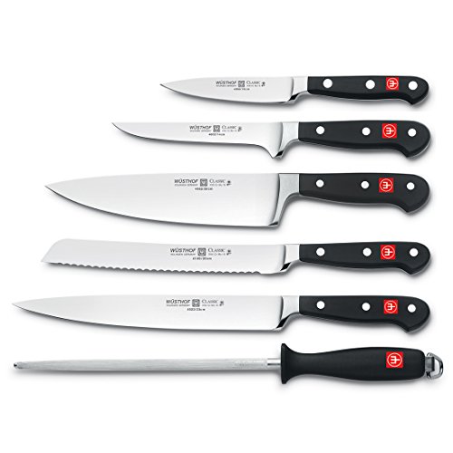 9751 Features: -Blade material: High carbon stainless steel. -Classic collection. -Pieces included: Sharpening steel, carving knife, chef's knife, bread knife, boning knife and paring knife. Number of Items Included: -6. Pieces Included: -Boning knife/Bread knife/Carving knife/Chef's knife/Paring knife/Sharpening steel. -Boning Knife Blade Length: 5". Blade Material: -High carbon stainless steel. Dimensions: Overall Product Weight: -2.76 Pounds.Including more than just the basics, Wusthof’s complete six piece cook’s set will start newlyweds or college students off in style. Chop vegetables, slice turkey, bone fish, skin oranges, and slice hearty pieces of rustic bread with a different tool catered to each task. More specifically, a 3-inch paring knife, 9-inch carver, 8-inch chef’s knife, 8-inch bread knife, and 5-inch boning knife comprise the set. Accompanying sharpening steel is provided to keep blades in tip-top shape. Backed with a lifetime warranty, each tool in the collec...